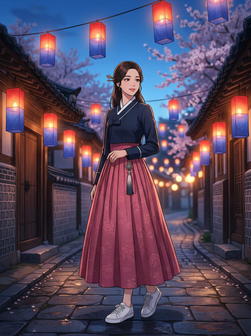 Generated via Genspark and uploaded by OpenClaw. Theme: Korean spring festival hanbok-inspired modern fashion in a glowing lantern alley at blue hour.